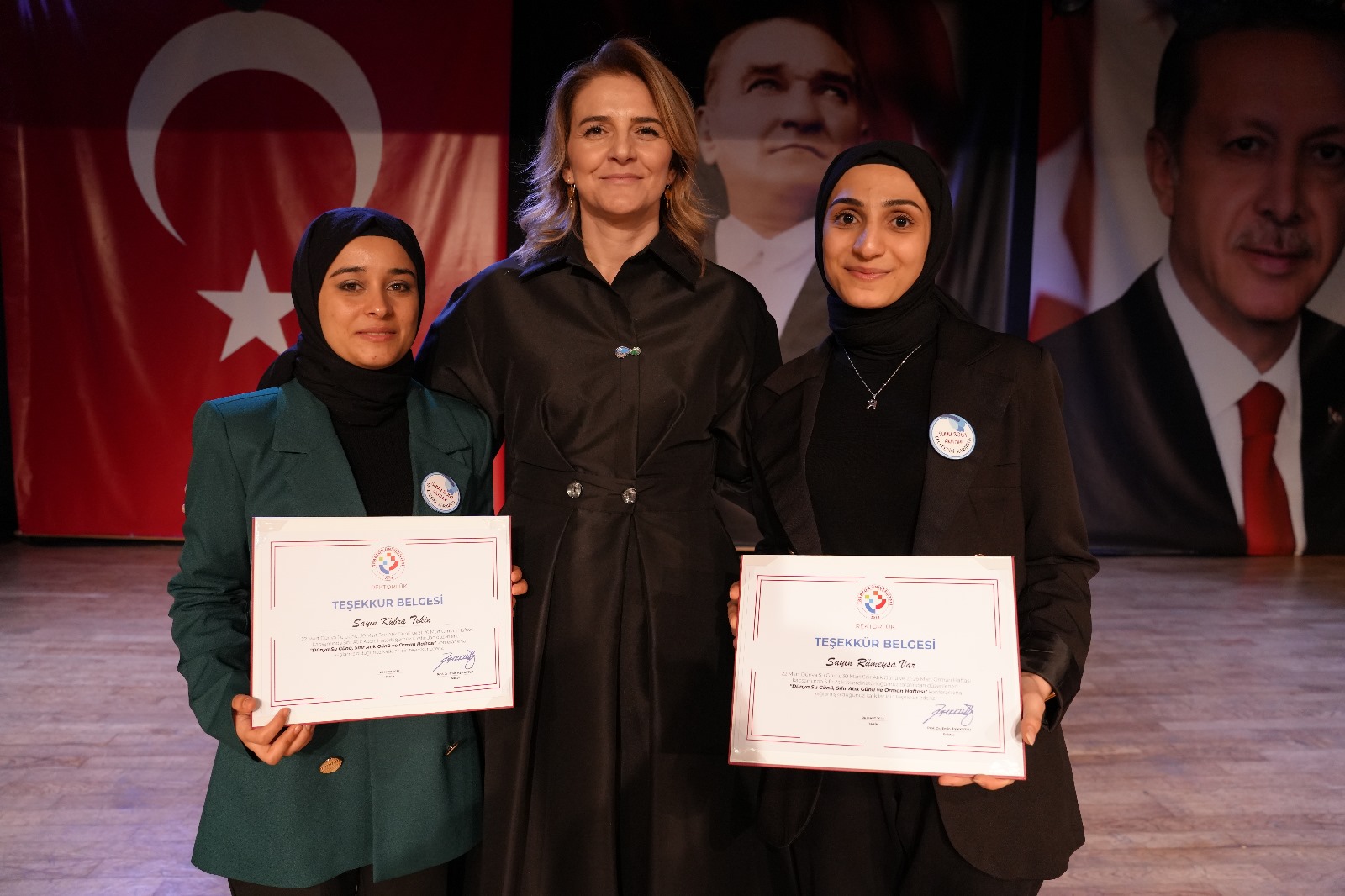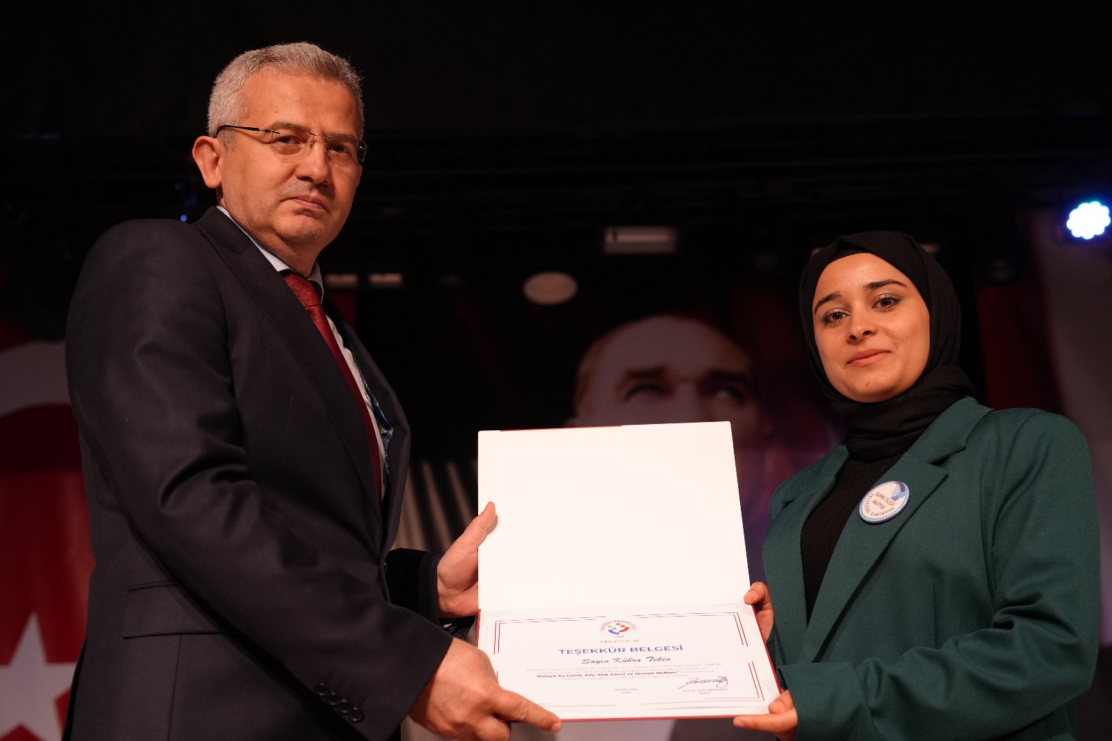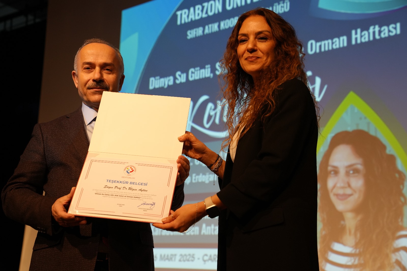 Kübra Tekin ve Rümeysa Var adlı TRÜ Fen Bilgisi Öğretmenliği Bölümü son sınıf öğrencilerinin TÜBİTAK destekli 2209-A kodlu Sıfır Atık konulu projelerinin sunumunun yapıldığı etkinlikte su tasarrufu, ağaç sevgisi, sıfır atık bilinci ve çevre duyarlılığı konularına değinildi.. Sunum yapan öğrencilere Çevre Şehircilik ve İklim Değişikliği Bakanlığı İl Müdürü Uğur Korkmaz tarafından teşekkür belgesi takdim edilerek üniversitemiz tarafından hazırlanan hediyeler verildi. Program akışında Okul Öncesi Öğretmenliği Bölümü öğrencilerince farkındalık kazandırmak amacıyla hazırlanan video gösterileri yüzlerde tebessüm oluşturdu. Konferansa katkıda bulunan hocalara da birer teşekkür belgesi, rozet ve fidan hediye edildi. Etkinlik sonunda Trabzon Orman Fidanlık Müdürlüğünden temin edilen fıstık çamları katılımcılara dağıtıldı.